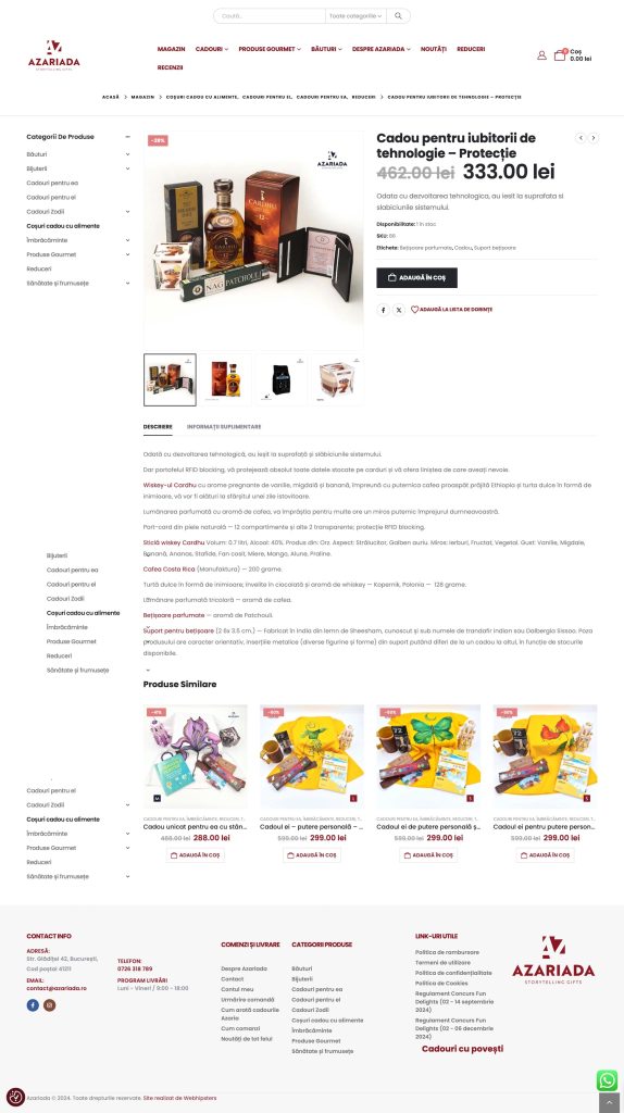 Azariada is a Romanian online gift shop with a unique mission: to create gifts that carry a story, designed to bring joy both to those who give and those who receive. Unlike standard e-commerce gift shops, Azariada curates premium, often handcrafted items into themed packages that reflect emotions, passions, or meaningful experiences.